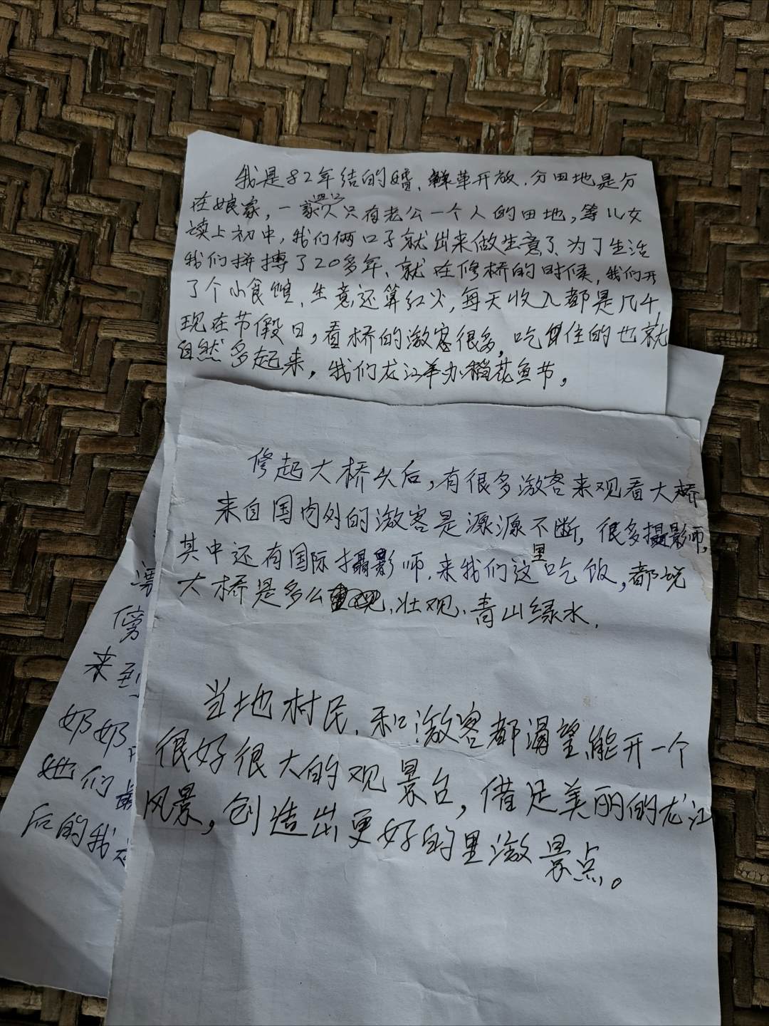 與記者相比,龍陵縣邦煥村的村民們體會(huì)更深。邦煥村在龍江大橋底下,是個(gè)傳統(tǒng)農(nóng)業(yè)村。村民劉從珍家里開小食館十多年,她專門手寫了大橋通車帶來的變化交給記者:在修建期間,村民務(wù)工工資由每天三五十元漲到一百多元,農(nóng)民種的蔬菜和養(yǎng)的豬雞鴨鵝都暢銷,附近群眾的錢包鼓起來了;修起大橋后很多游客來看大橋,還有國(guó)際攝影師,來我們這里吃飯……在村上干了二十多年的老支書王寶昌如數(shù)家珍:橋修好后進(jìn)村道路也硬化了,大卡車開進(jìn)村,如今村里每年出欄生豬兩千多頭、銷售二百多噸茶葉和三百多噸無筋豆,村民人均純收入早就過了萬元……
