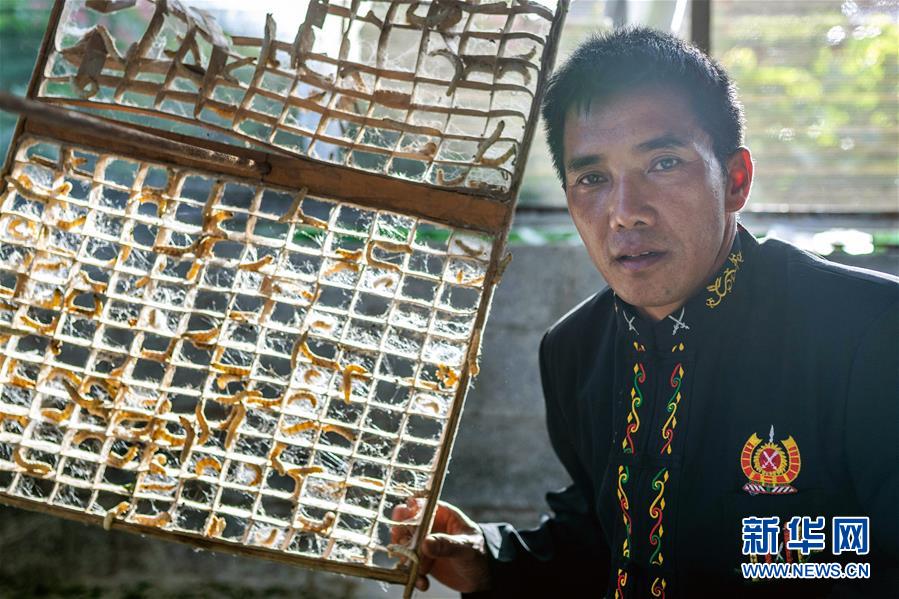 在云南省隴川縣隴把鎮(zhèn)曼崩村,董跑約在蠶棚里給“蠶寶寶”喂桑葉(8月21日攝)。 新華社記者 胡超 攝 曼崩村氣候溫和,田地肥沃,水資源豐富,適合種桑養(yǎng)蠶。“一開始并非所有村民都敢養(yǎng)蠶,大家怕白費工夫?!倍瓨蛳嗾f,為了讓群眾吃下“定心丸”,激發(fā)大家的積極性,隴把鎮(zhèn)黨委政府派出黨員干部進村入戶宣講蠶桑產(chǎn)業(yè)扶持政策,引進企業(yè)專業(yè)技術(shù)人員,到田間地頭開展培訓,手把手教會村民種桑養(yǎng)蠶。 董跑約告訴記者,種桑養(yǎng)蠶第一年每畝桑葉可養(yǎng)殖一張蠶種,平均一張蠶種產(chǎn)繭45公斤,以最低價格每公斤36.8元計算,一張蠶種平均收入1656元;第二年起每畝可養(yǎng)殖兩張蠶種,畝均收入3300元左右。今年他家種了16畝桑樹,預(yù)計收入超過5萬元。 曼崩村家家戶戶參與到了種桑養(yǎng)蠶行列中。2019年底,全村年人均純收入達到7826元,成功脫貧出列。
