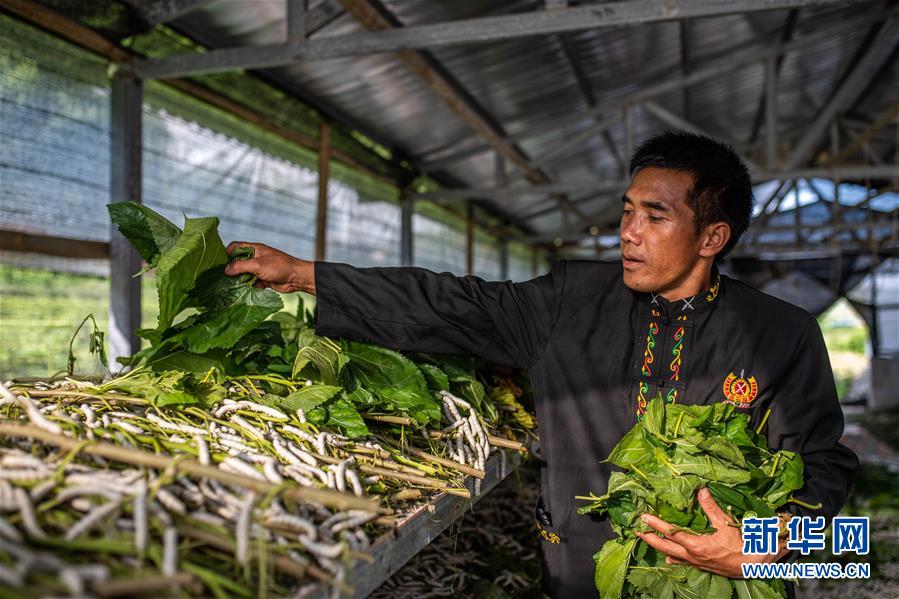 2020-09-05 21:40:24 來源:新華網(wǎng) 責任編輯:黃麗紅 作者:字強、胡超新華社昆明9月5日電 題:遍身羅綺者,亦是養(yǎng)蠶人——云南偏遠邊疆村寨奔小康 新華社記者字強、胡超 中緬邊境,萬畝綠油油的桑樹向陽生長,郁郁蔥蔥。 49歲的景頗族漢子董跑約在桑田里忙碌著,他要把鮮嫩的桑葉及時收割下來,喂養(yǎng)蠶棚里的幼蠶。他種了大半輩子甘蔗、水稻,經(jīng)歷了吃不飽、穿不暖、住茅草房的苦日子,近三年種桑養(yǎng)蠶后,不僅收入翻番、吃穿不愁,還蓋了新房、買了轎車。 董跑約所在的云南省隴川縣隴把鎮(zhèn)曼崩村是一個景頗族村落,有農(nóng)戶52戶236人,其中建檔立卡貧困戶21戶69人。 新中國成立前,董跑約的先輩們困居深山叢林中,以狩獵、刀耕火種為生,直到20世紀末才陸續(xù)搬到如今的曼崩村。 董跑約告訴記者,搬出大山后,村民們在茅草房里熬了很長一段時期,直到2006年,在國家政策幫扶下,村民們才蓋起土木結(jié)構(gòu)的瓦房。2014年國家啟動精準扶貧工程,村民們又陸續(xù)新建了磚房,實現(xiàn)“安居夢”。 “最大的改變還是產(chǎn)業(yè)?!倍芗s說,種水稻、玉米勉強夠吃,賺不來錢。近年來,政府鼓勵村民種桑養(yǎng)蠶,大家的收入一下子提高了很多。 據(jù)隴把鎮(zhèn)黨委書記董橋相介紹,2017年以來,在上海市青浦區(qū)對口幫扶下,曼崩村陸續(xù)種植了500余畝桑樹,連年大豐收,村民們邁入了增收致富的“快車道”。