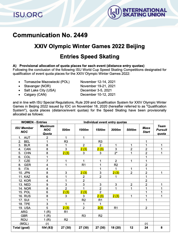 北京冬奧會(huì)速度滑冰女子項(xiàng)目席位分配情況。圖/國(guó)際滑聯(lián)官網(wǎng) 速度滑冰女子項(xiàng)目分為500米、1000米、1500米、3000米、5000米、集體出發(fā)以及團(tuán)體追逐7個(gè)小項(xiàng),共有104個(gè)參賽席位,速度滑冰項(xiàng)目的霸主荷蘭隊(duì)拿到全部17個(gè)席位。4站世界杯,中國(guó)速度滑冰女隊(duì)表現(xiàn)不俗,總計(jì)斬獲14個(gè)席位,實(shí)現(xiàn)全項(xiàng)目參賽,其中1000米、1500米、集體出發(fā)3個(gè)小項(xiàng)拿到滿額參賽席位。