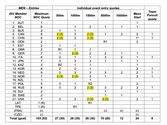 北京冬奧會(huì)速度滑冰男子項(xiàng)目席位分配情況。圖/國(guó)際滑聯(lián)官網(wǎng) 速度滑冰男子項(xiàng)目分為500米、1000米、1500米、5000米、10000米、集體出發(fā)以及團(tuán)體追逐7個(gè)小項(xiàng),共有103個(gè)參賽席位,荷蘭速度滑冰男隊(duì)同樣拿滿17個(gè)席位。除了5000米、10000米兩個(gè)長(zhǎng)距離項(xiàng)目,中國(guó)速度滑冰男隊(duì)拿到其余5個(gè)小項(xiàng)的參賽資格,總計(jì)8個(gè)參賽席位。 據(jù)國(guó)際滑聯(lián)介紹,北京冬奧會(huì)速度滑冰項(xiàng)目的參賽席位并未最終確定。以中國(guó)速度滑冰隊(duì)為例,在女子500米、5000米以及男子500米、1500米4個(gè)小項(xiàng)上,由于順位靠前,如果有其他隊(duì)伍的運(yùn)動(dòng)員無法參賽,中國(guó)運(yùn)動(dòng)員仍有機(jī)會(huì)遞補(bǔ)參賽。 此外,國(guó)家體育總局冬季運(yùn)動(dòng)管理中心今天發(fā)布公告,經(jīng)研究決定,寧忠?guī)r、高亭宇兩位中國(guó)男子速滑名將已經(jīng)獲得北京冬奧會(huì)參賽資格。結(jié)合國(guó)際滑聯(lián)公布的參賽席位,其余4名男運(yùn)動(dòng)員、8名女運(yùn)動(dòng)員將通過中國(guó)速度滑冰隊(duì)的內(nèi)部選拔產(chǎn)生。 北京冬奧會(huì)中國(guó)速度滑冰隊(duì)參賽席位 女子:500米(2個(gè))、1000米(3個(gè))、1500米(3個(gè))、3000米(2個(gè))、5000米(1個(gè))、集體出發(fā)(2個(gè))、團(tuán)體追逐(1個(gè)) 男子:500米(2個(gè))、1000米(2個(gè))、1500米(2個(gè))、集體出發(fā)(1個(gè))、團(tuán)體追逐(1個(gè)) 新京報(bào)記者 徐邦印 |