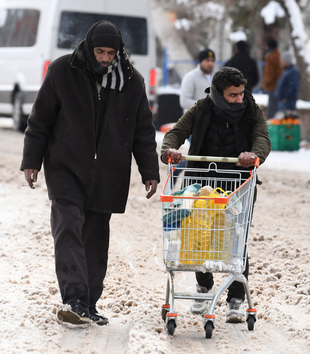 2月7日,在埃爾比斯坦地區(qū),當(dāng)?shù)鼐用裨诮诸^運(yùn)輸物資。