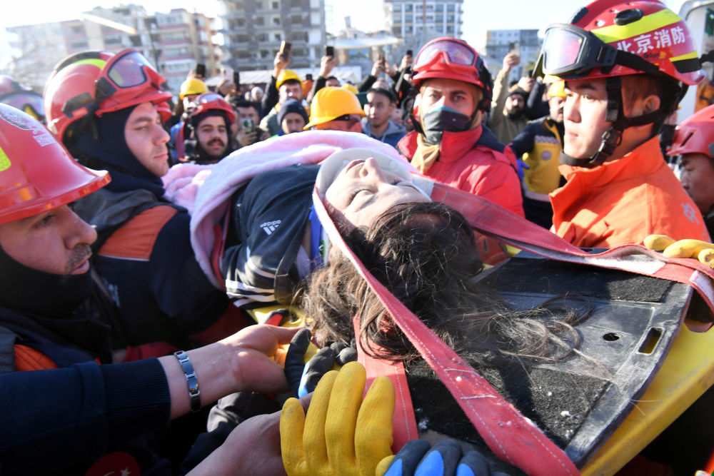 2月9日,在安塔基亞市,中國(guó)救援隊(duì)與土耳其救援隊(duì)轉(zhuǎn)移一名救出的幸存者。