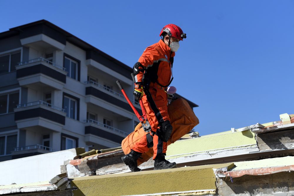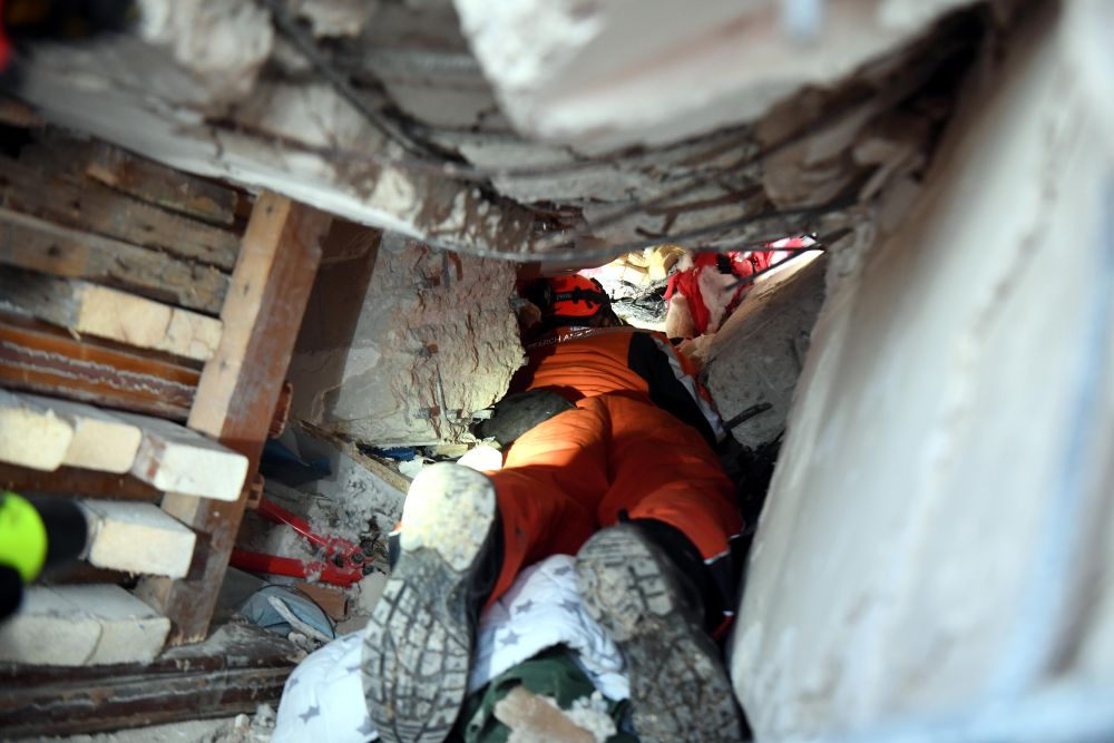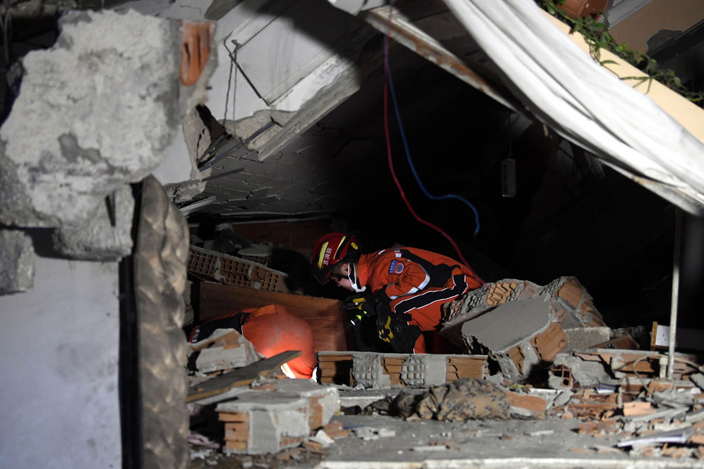 2月7日晚,在埃爾比斯坦地區(qū),救援人員在一處地震廢墟搜救。
