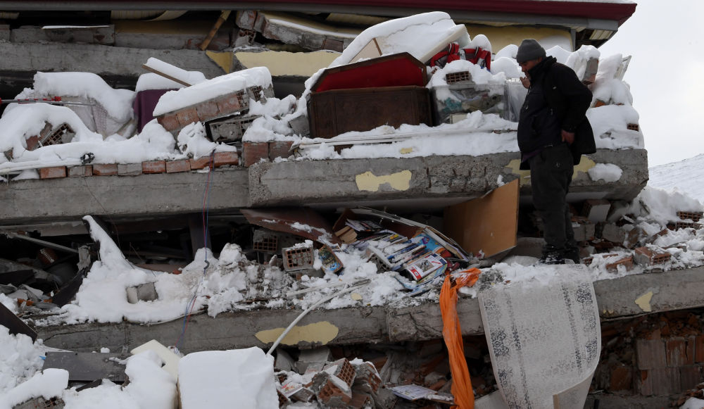 2月7日,在埃爾比斯坦地區(qū),一名男子在地震中受損的建筑物中搜尋親人。