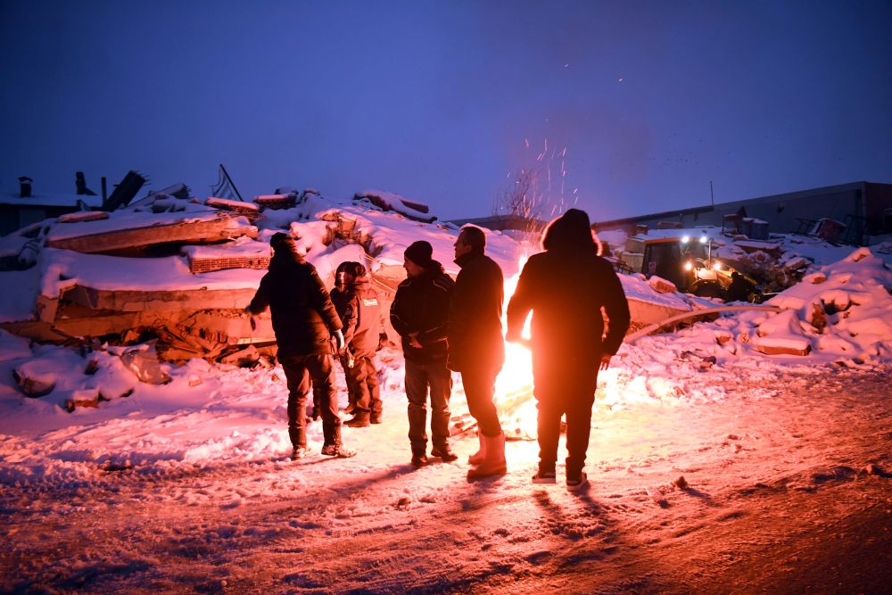 2月7日晚,在埃爾比斯坦地區(qū),救援人員在廢墟旁燒火取暖。