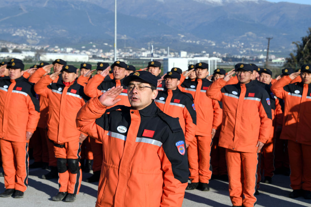 2月10日,中國(guó)救援隊(duì)隊(duì)員在安塔基亞市的駐扎營(yíng)區(qū)參加升旗儀式。