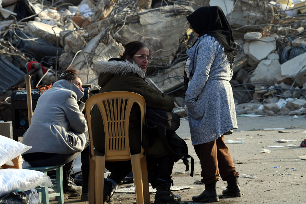2月10日,人們聚集在安塔基亞市的一處地震廢墟旁。