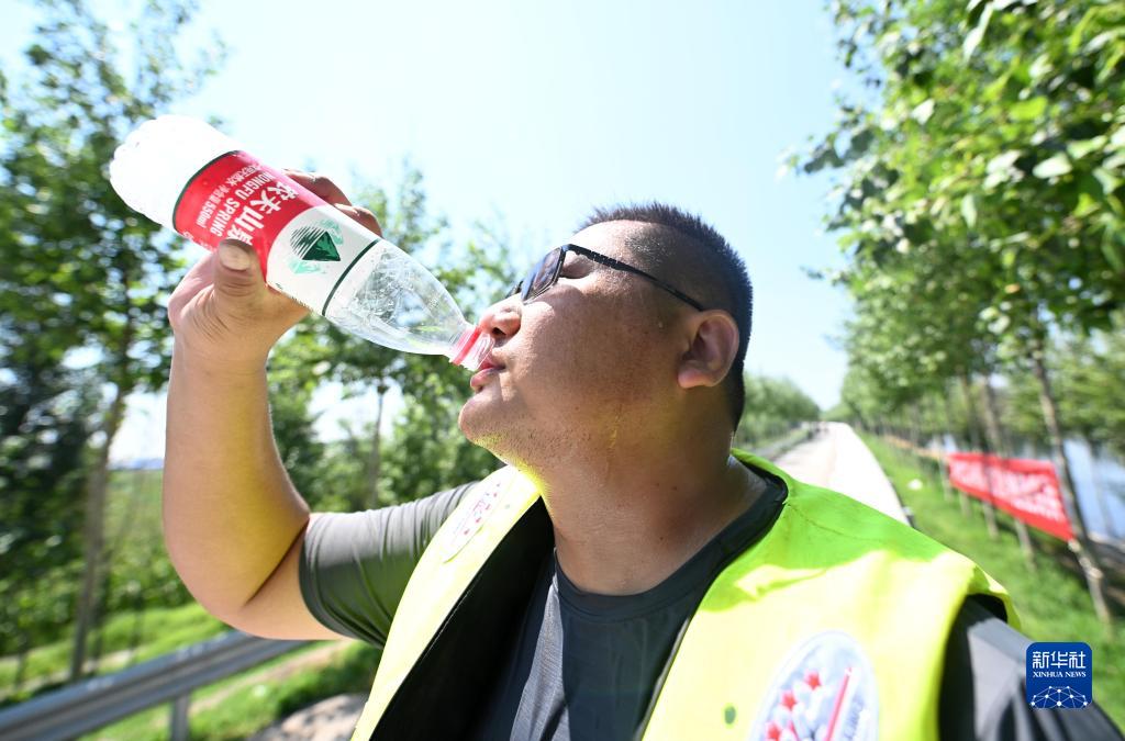 8月15日,應(yīng)急搶險(xiǎn)隊(duì)隊(duì)員在巡護(hù)途中補(bǔ)水。