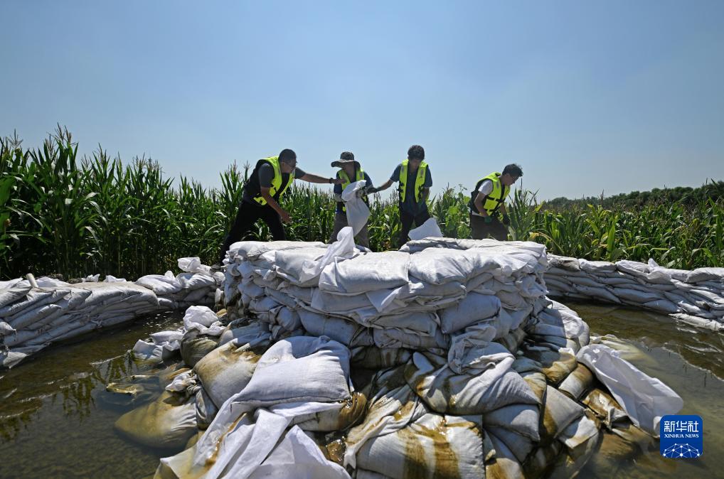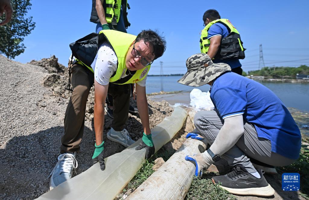 8月15日,應(yīng)急搶險(xiǎn)隊(duì)在天津市靜海區(qū)臺(tái)頭鎮(zhèn)清北地區(qū)北圍埝上調(diào)整抽水袋。