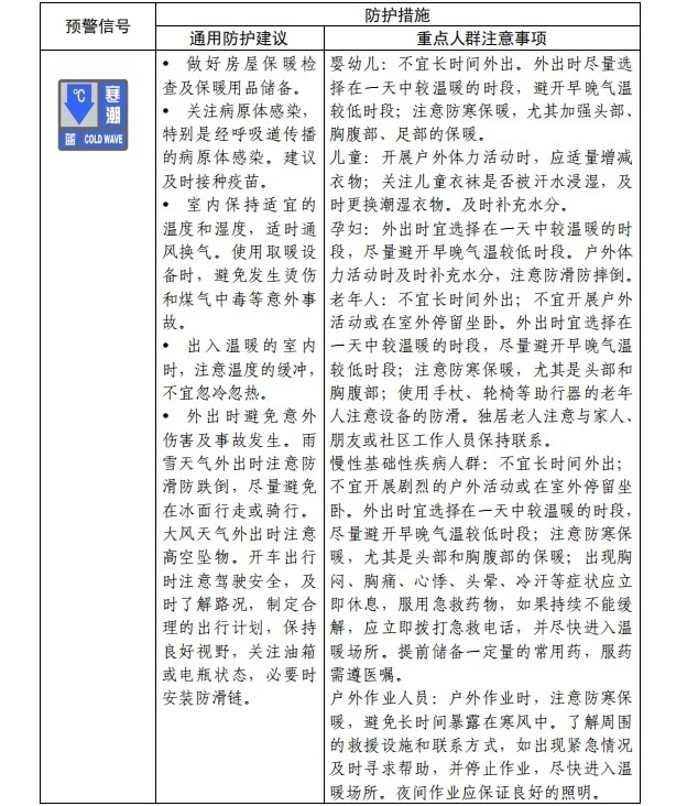 五、分級防護措施指南 針對寒潮預警信號等級,我們提出分級人群防護措施建議。