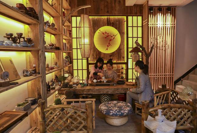 游客在獵神村商業(yè)街內(nèi)茶室品茶。熊偉攝