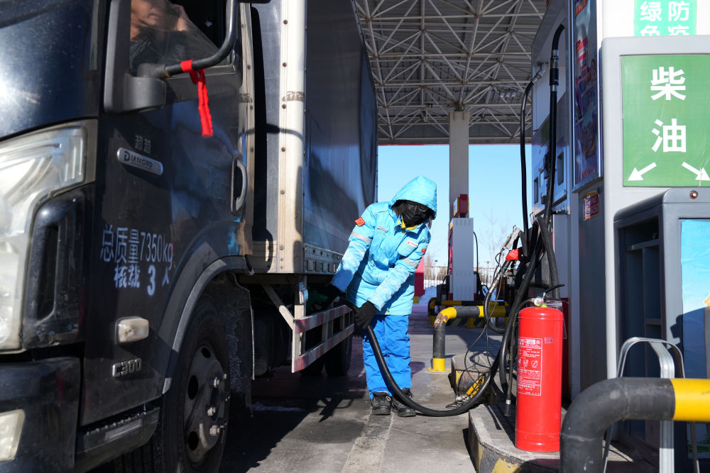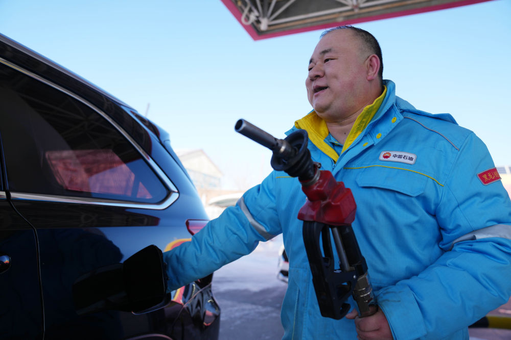 2月2日,中石油黑龍江撫遠(yuǎn)東方第一加油站加油員肖洋靈在給車(chē)輛加油。