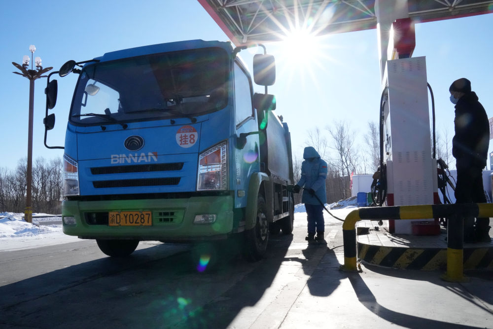2月2日,中石油黑龍江撫遠(yuǎn)東方第一加油站的員工給車(chē)輛加油。