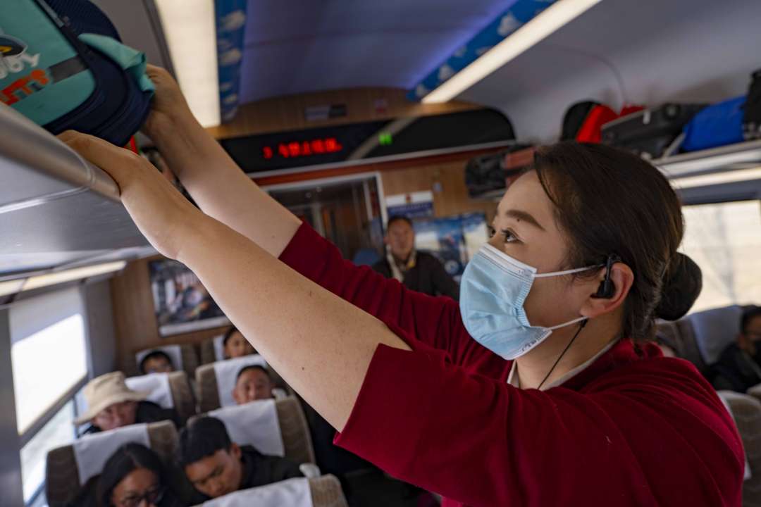 記者跟隨乘務(wù)員,體驗(yàn)他們一天的工作。 隨著春節(jié)及藏歷新年假期進(jìn)入尾聲,西藏春運(yùn)迎來返程高峰。2月17日,記者跟隨來到了青藏鐵路拉薩至日喀則的列車上,通列車員一道感受春運(yùn)高峰的忙碌。 一趟車上,列車員格外忙碌。發(fā)車前,青藏鐵路動(dòng)車組拉林段四組班長列車員李丹站在車門口,對上車的旅客反復(fù)叮囑:“上車注意腳下安全!”;車門關(guān)閉后,她又忙不停蹄地在車廂內(nèi)來回穿梭,幫旅客檢查行李,“我?guī)湍硪幌履男欣睿 ?;列車啟?dòng)后,李丹又抓緊用給旅客提示“列車內(nèi)禁止吸煙!”