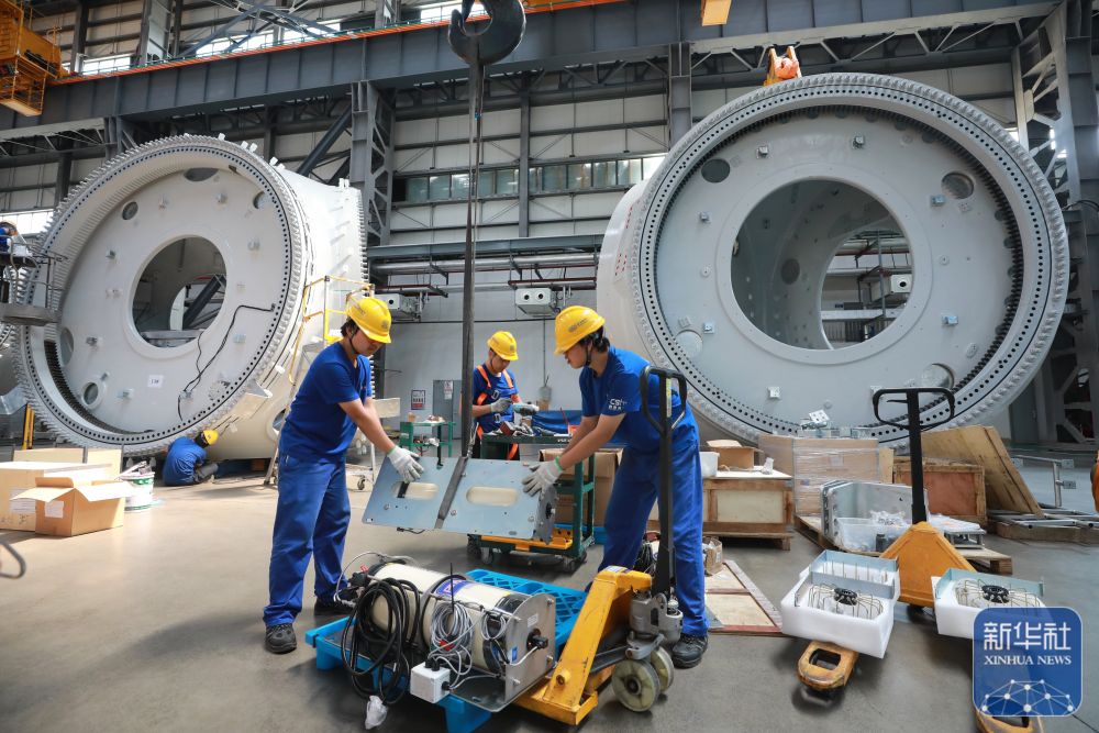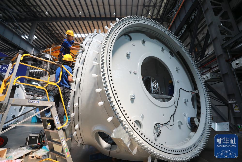 ↑8月8日,在福建三峽海上風(fēng)電國際產(chǎn)業(yè)園東方電氣風(fēng)電(福建)有限公司的生產(chǎn)現(xiàn)場,工人在生產(chǎn)18兆瓦半直驅(qū)海上風(fēng)電機(jī)組。