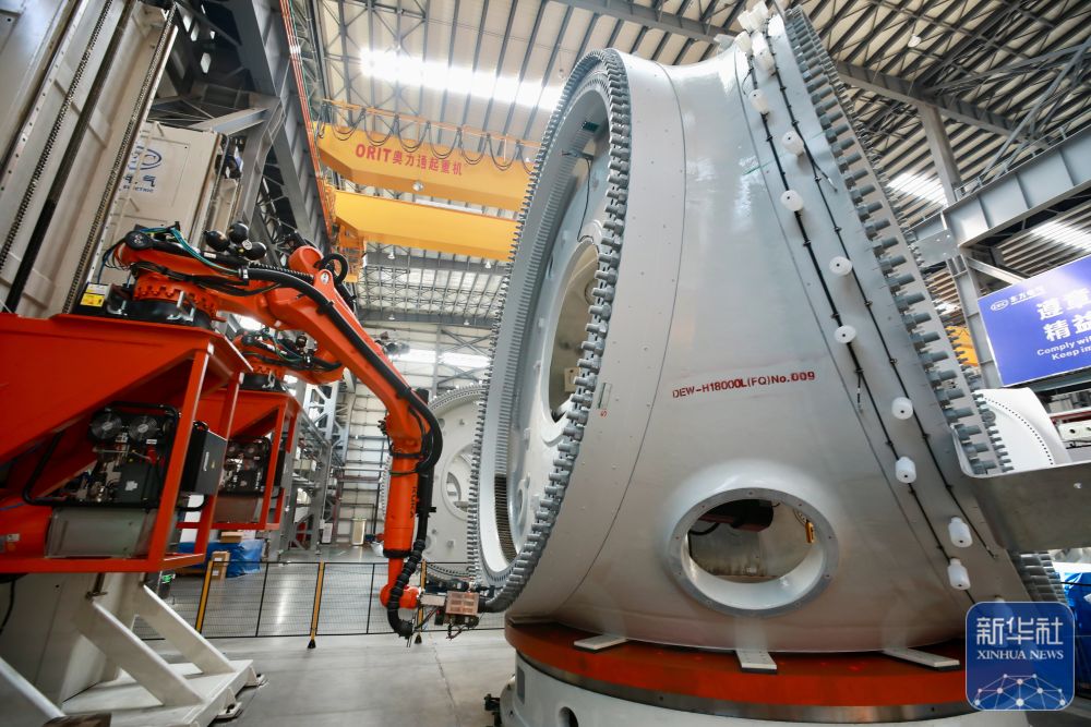 ↑8月8日,在福建三峽海上風(fēng)電國際產(chǎn)業(yè)園東方電氣風(fēng)電(福建)有限公司的生產(chǎn)現(xiàn)場,機(jī)械臂在生產(chǎn)18兆瓦半直驅(qū)海上風(fēng)電機(jī)組。
