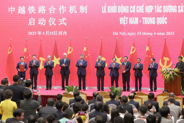 4月15日,中共中央總書記、國家主席習近平在河內(nèi)國際會議中心同越共中央總書記蘇林共同出席中越鐵路合作機制啟動儀式。