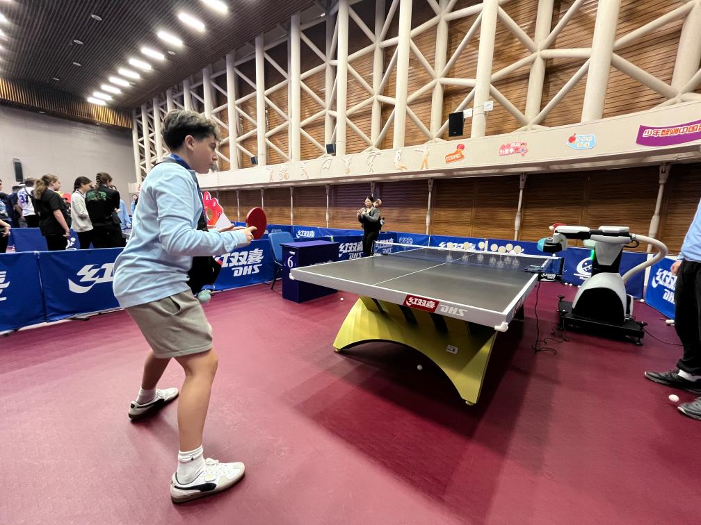 4月12日,美國青少年在上海國際乒聯(lián)博物館和中國乒乓球博物館的乒乓球發(fā)球機(jī)器人前體驗(yàn)接球。新華社記者有之炘攝 二樓體驗(yàn)區(qū)的乒乓球發(fā)球機(jī)器人前,學(xué)生們輪番挑戰(zhàn)。曾在美國全國U14乒乓球比賽中拿下過第7名的瑞恩·特洛伊·李揮拍上陣,飛快的反應(yīng)速度引發(fā)伙伴們此起彼伏的歡呼和掌聲。 普爾斯維爾高中的伊恩·斯科特·哈珀捧著體驗(yàn)紀(jì)念證書與同伴興奮合影:“相比匹克球,乒乓球節(jié)奏更快,對反應(yīng)速度和擊球精度要求更高。我喜歡這里的氛圍,處處彰顯著體育的魅力!”