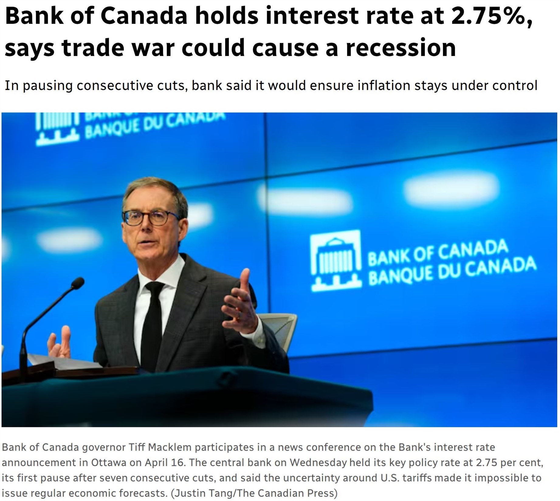 △路透社報(bào)道截圖(題圖為歐洲央行行長(zhǎng)拉加德) 多名專家指出,在通脹下降、經(jīng)濟(jì)增長(zhǎng)乏力的背景下,如果貿(mào)易摩擦狀況進(jìn)一步惡化,不排除歐洲央行被迫采取更激進(jìn)降息措施的可能。 無(wú)論各國(guó)央行的決策如何,各國(guó)貨幣政策管理者都對(duì)美國(guó)單邊貿(mào)易政策表達(dá)了擔(dān)憂。 當(dāng)?shù)貢r(shí)間16日,加拿大央行——加拿大銀行宣布將基準(zhǔn)利率維持在當(dāng)前2.75%的水平不變。在該機(jī)構(gòu)看來(lái),美國(guó)貿(mào)易政策方向的重大轉(zhuǎn)變和關(guān)稅政策的不可預(yù)測(cè)性增加了不確定性、拖累經(jīng)濟(jì)增長(zhǎng)前景并推高通脹預(yù)期。 加拿大銀行上個(gè)月剛剛宣布將基準(zhǔn)利率下調(diào)25個(gè)基點(diǎn)至2.75%,并表示盡管加拿大經(jīng)濟(jì)今年開(kāi)局強(qiáng)勁,但貿(mào)易緊張局勢(shì)加劇和美國(guó)關(guān)稅政策可能減緩加拿大經(jīng)濟(jì)活動(dòng)步伐,并增加通脹壓力。