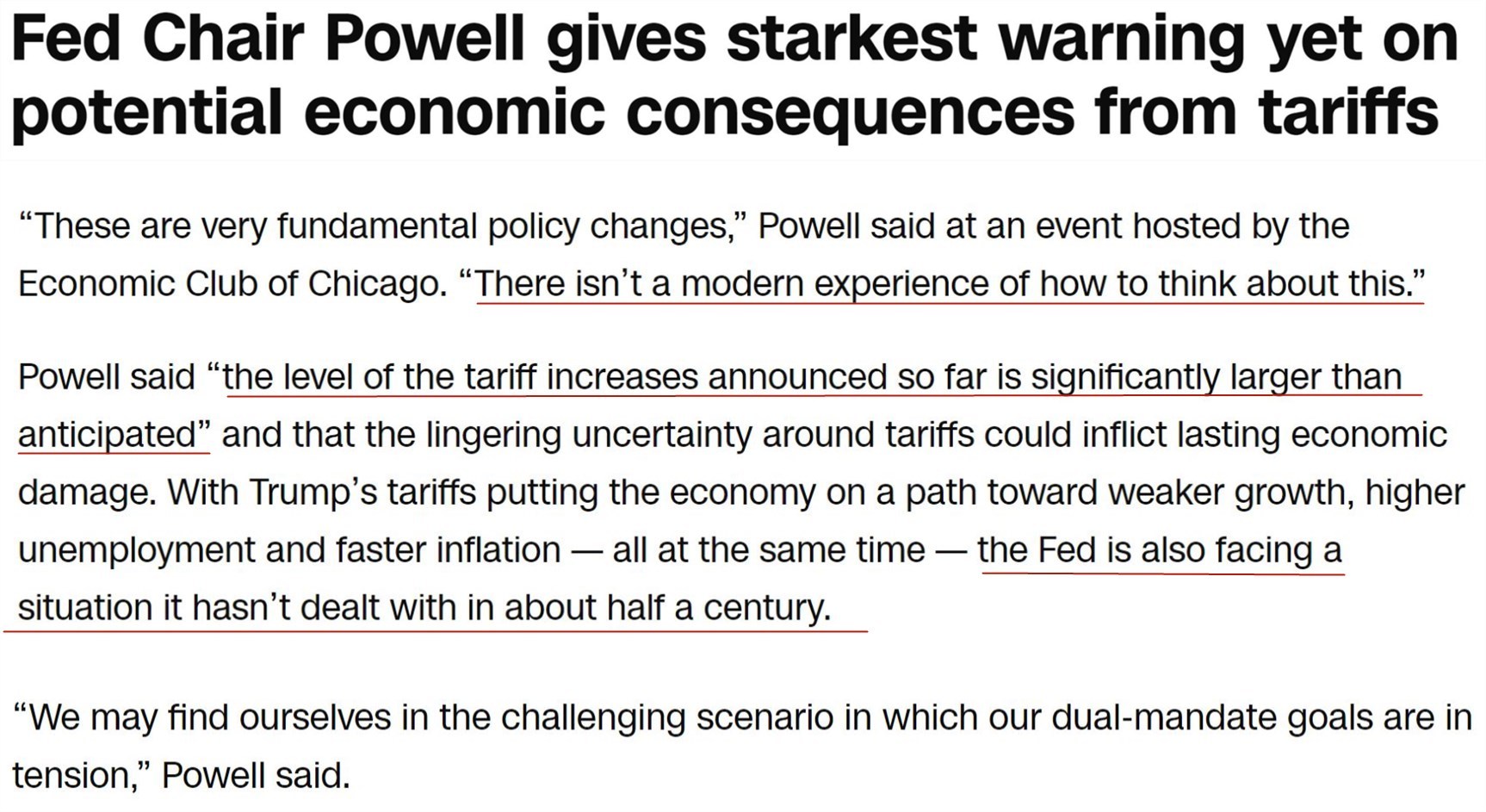 △特朗普社交媒體帖文截圖 此前一天,鮑威爾在芝加哥經(jīng)濟(jì)俱樂(lè)部發(fā)表講話時(shí)指出,美國(guó)政府已宣布的關(guān)稅上調(diào)幅度遠(yuǎn)超預(yù)期水平,其帶來(lái)的經(jīng)濟(jì)影響同樣可能超出預(yù)期,令美聯(lián)儲(chǔ)貨幣政策制定面臨更棘手的局面。 “大多數(shù)時(shí)候,當(dāng)經(jīng)濟(jì)疲軟時(shí),通脹率會(huì)低、失業(yè)率會(huì)高。這兩種情況都需要降低利率來(lái)應(yīng)對(duì)。所以大多數(shù)時(shí)候,(控通脹和保就業(yè))這兩個(gè)政策目標(biāo)并不矛盾。但在當(dāng)前(關(guān)稅政策)的沖擊影響下,我們觀察到的指標(biāo)顯示失業(yè)率和通脹率將同時(shí)上升。但我們的政策工具在同一時(shí)間點(diǎn)只能用于解決一個(gè)問(wèn)題?!?/p>