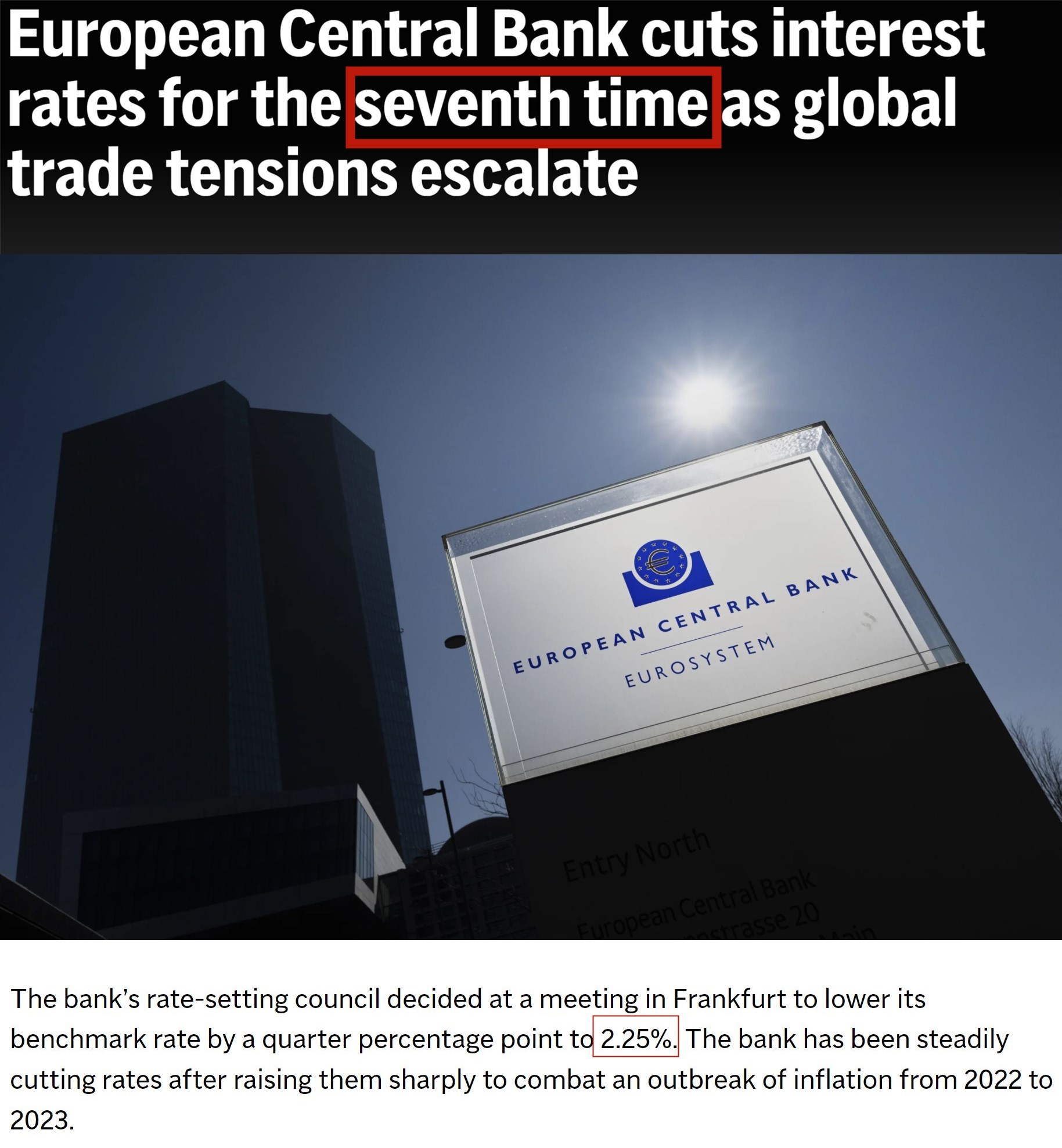 △阿特·霍根接受雅虎財(cái)經(jīng)網(wǎng)站采訪 “美國(guó)的政策正在損害市場(chǎng)對(duì)美元的信心” 值得注意的是,在特朗普指責(zé)美聯(lián)儲(chǔ)不同意降息的時(shí)候,歐洲央行已經(jīng)被迫行動(dòng)起來(lái)了。 歐洲央行17日在位于德國(guó)法蘭克福的總部召開(kāi)議息會(huì)議,決定將三大關(guān)鍵利率下調(diào)25個(gè)基點(diǎn),這是歐洲央行自去年6月以來(lái)第七次降息。