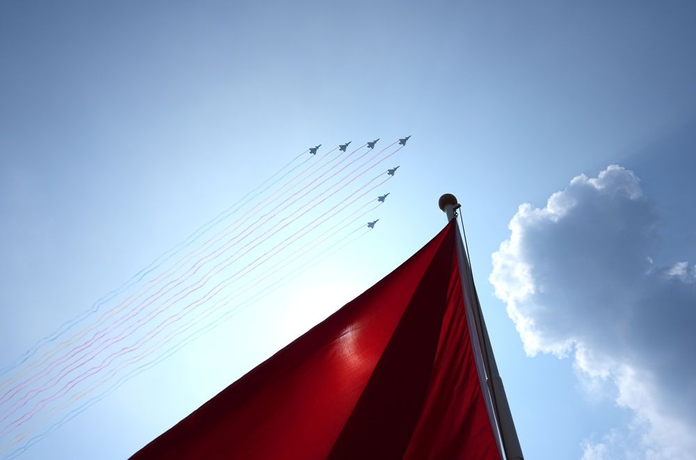2025年9月3日,紀(jì)念中國人民抗日戰(zhàn)爭暨世界反法西斯戰(zhàn)爭勝利80周年大會在北京隆重舉行。這是教練機梯隊接受檢閱。新華社記者 朱崢 攝