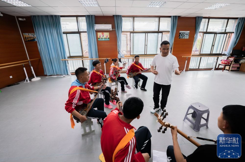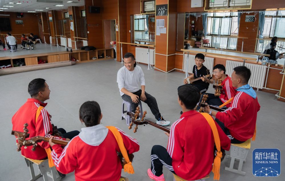 ↑ 9月9日,在拉薩市第二中等職業(yè)技術(shù)學(xué)校,洛桑次仁老師在給孩子們傳授扎念琴彈奏的要領(lǐng)。