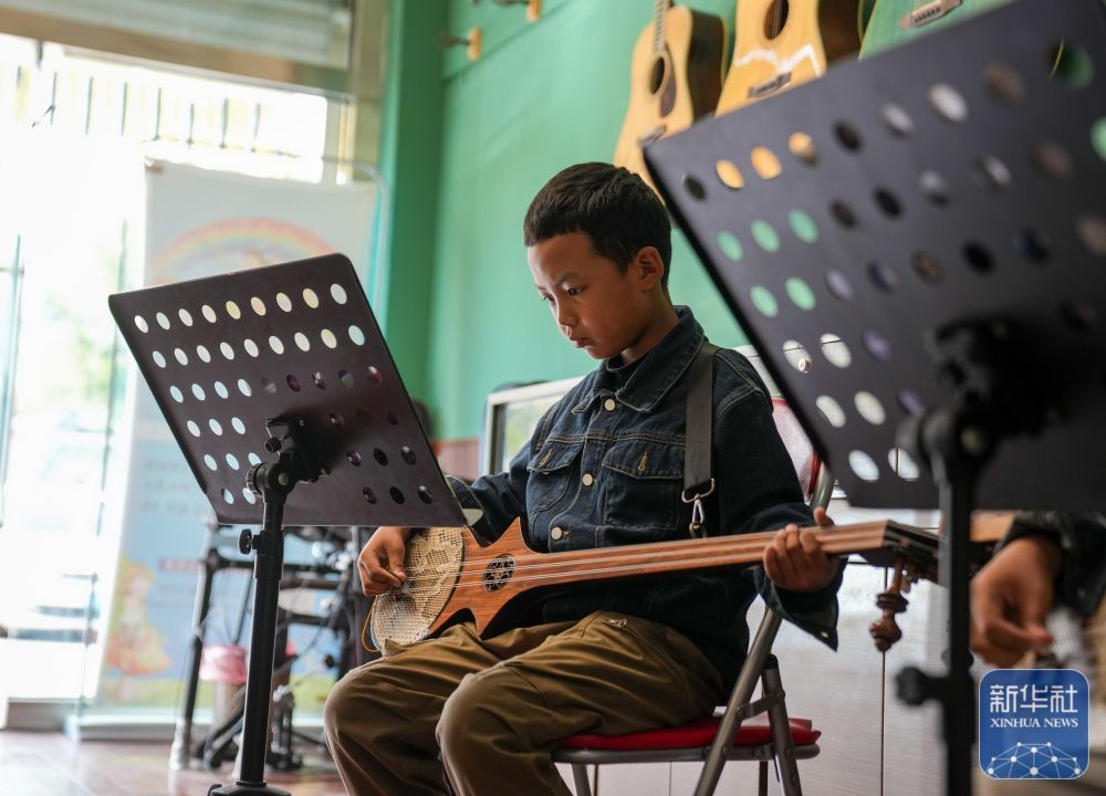 ↑ 9月13日,在拉薩市古樂扎念琴行,一名男孩在彈奏扎念琴。