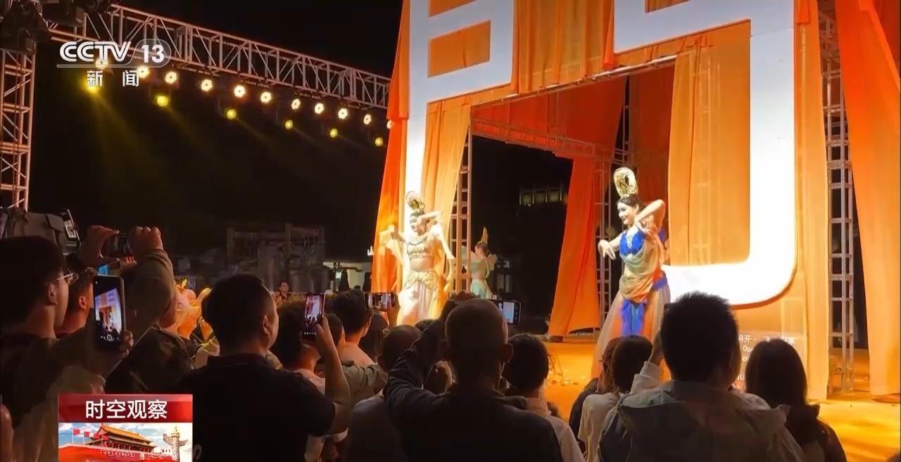鳳凰剛過(guò),敦煌古樂(lè)隨即響起。在天門(mén)洞這座天然畫(huà)框前,五位“飛天”舞者身著敦煌霓裳登場(chǎng),民俗與山水在此刻完美交融。
