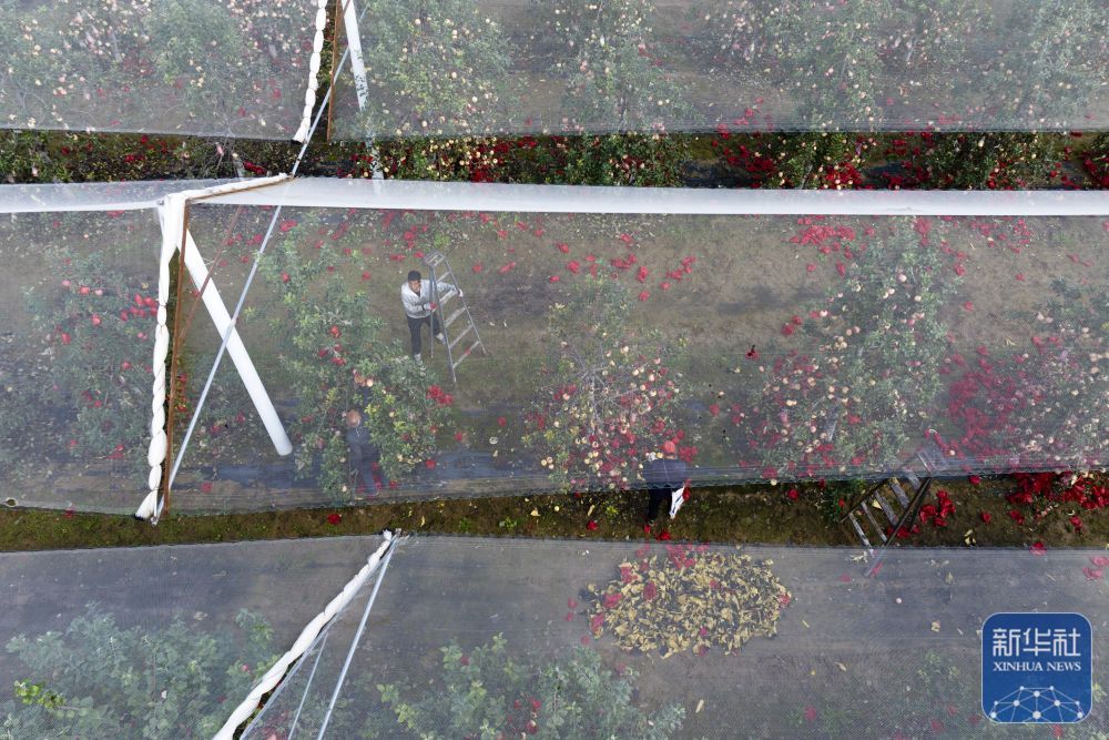 ↑ 10月17日,果農(nóng)在延安市寶塔區(qū)橋溝街道煙洞溝村蘋果園內(nèi)摘掉蘋果套袋(無人機(jī)照片)。新華社記者 邵瑞 攝
