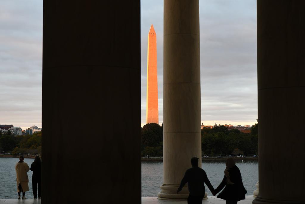 這是10月14日在美國(guó)華盛頓杰斐遜紀(jì)念堂拍攝的日落時(shí)分的華盛頓紀(jì)念碑。新華社記者李睿攝
