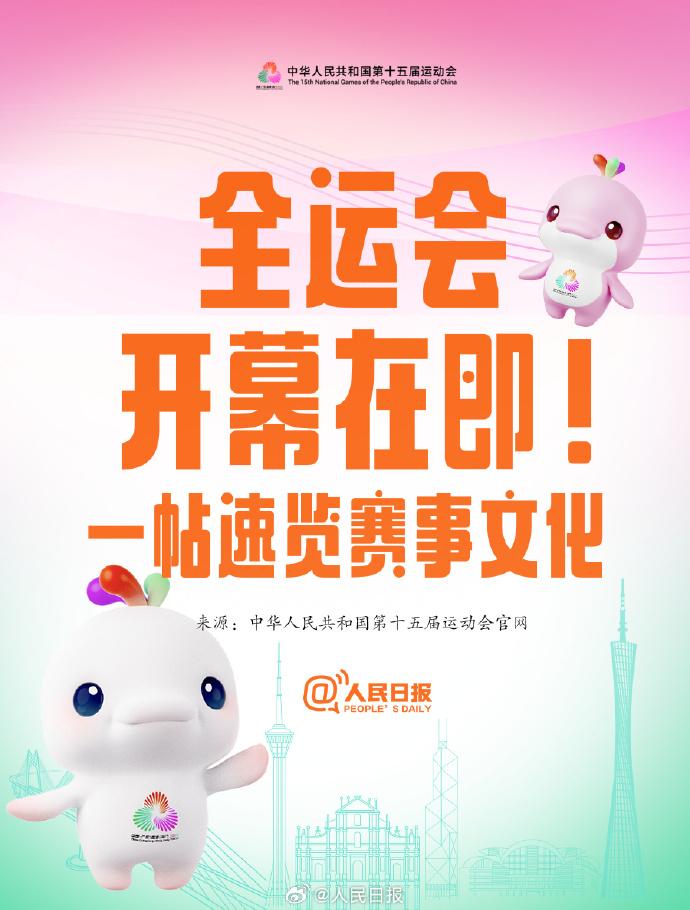 11月9日,第十五屆全運(yùn)會將開幕。本屆全運(yùn)會,賽事文化細(xì)節(jié)拉滿!會徽、獎牌和火炬里藏著哪些花?吉祥物喜洋洋、樂融融的原型是什么?會歌《氣勢如虹》你會唱了嗎?全運(yùn)會進(jìn)入2周倒計(jì)時(shí),收藏這些十五運(yùn)會的知識點(diǎn),期待開幕!