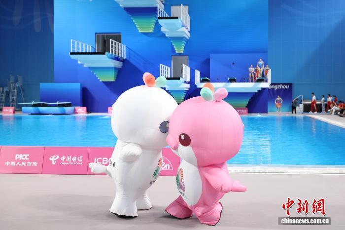 11月11日,第十五屆全國(guó)運(yùn)動(dòng)會(huì)跳水項(xiàng)目女子3米跳板決賽在廣東省奧體中心游泳跳水館舉行。圖為比賽前,十五運(yùn)會(huì)吉祥物帶來(lái)暖場(chǎng)表演?!≈行律缬浾?陳楚紅 攝