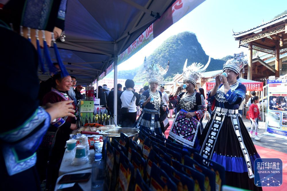 ↑在廣西柳州市融水苗族自治縣桿洞鄉(xiāng)烏英苗寨,村民梁足英(右一)、吳妹富(右二)和幫扶企業(yè)負(fù)責(zé)人在調(diào)制酸筍金湯(9月27日攝)。