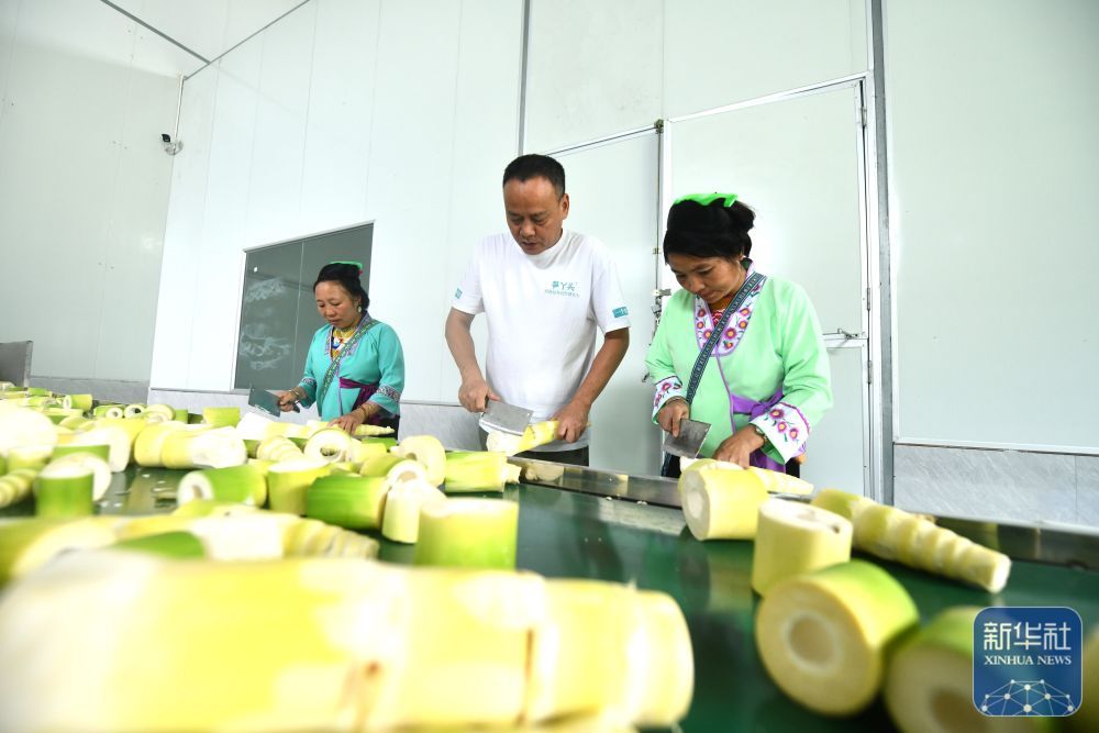 ↑在廣西柳州市柳江區(qū)成團(tuán)鎮(zhèn)六道村,烏英苗寨婦女梁足英(中)、吳妹富(右)和企業(yè)負(fù)責(zé)人在采摘竹筍(6月28日攝)。