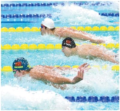 運(yùn)動(dòng)員在十五運(yùn)會(huì)游泳項(xiàng)目男子100米蝶泳決賽中。