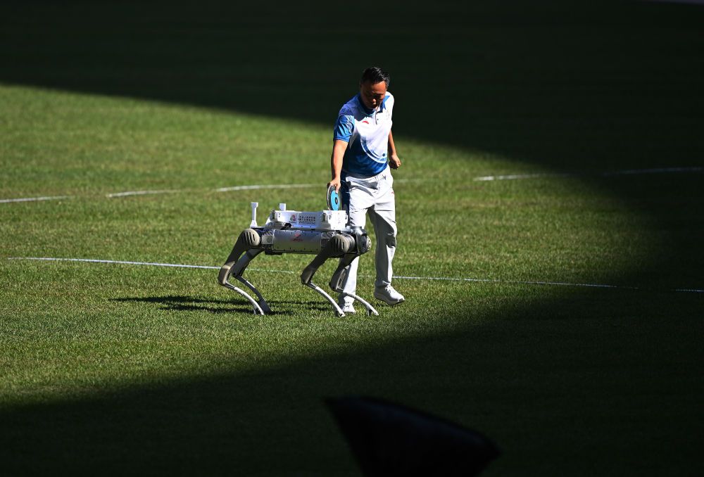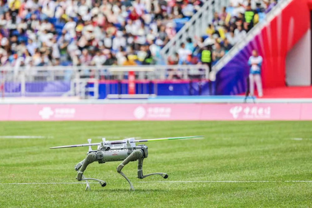 11月15日,機器狗在田徑項目女子標槍及格賽中運送標槍。