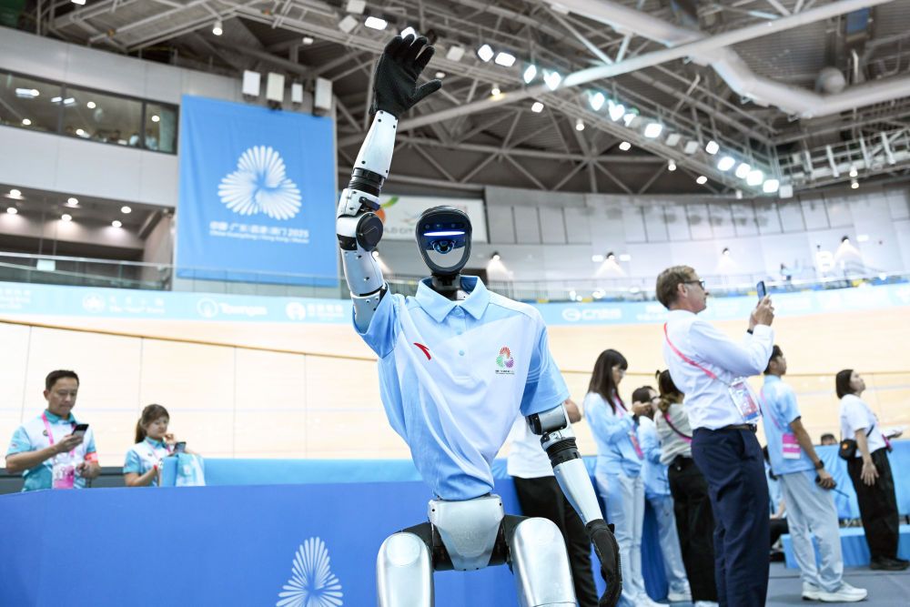 11月13日,參與場地自行車女子團體競速賽決賽賽前表演的機器人向現(xiàn)場觀眾招手互動。