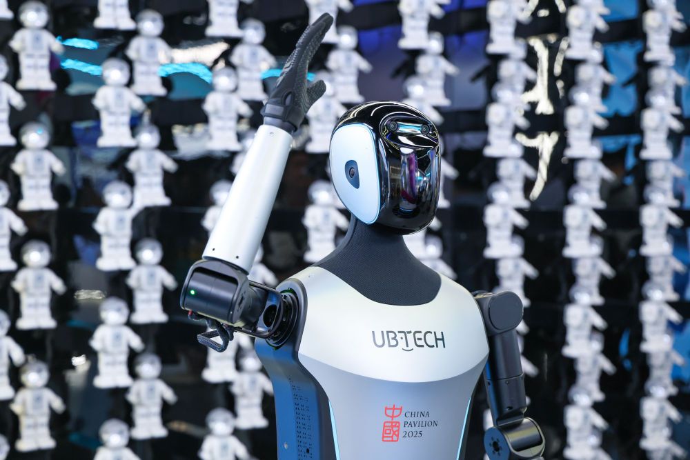 2025年4月23日,在深圳優(yōu)必選科技展廳內(nèi),商用版人形機器人Walker C向觀眾揮手致意。