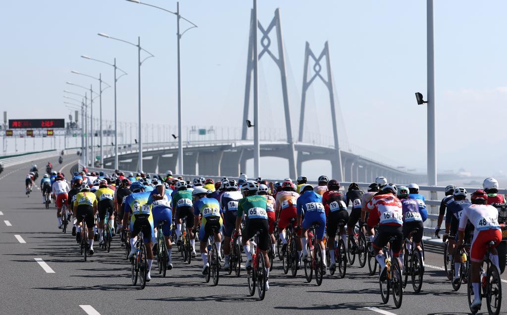 11月8日,參賽選手在港珠澳大橋騎行。當(dāng)日進(jìn)行的第十五屆全國運(yùn)動(dòng)會(huì)公路自行車男子個(gè)人賽,賽道全程231.8公里,選手經(jīng)過港珠澳大橋,跨越粵港澳三地。圖源:新華社