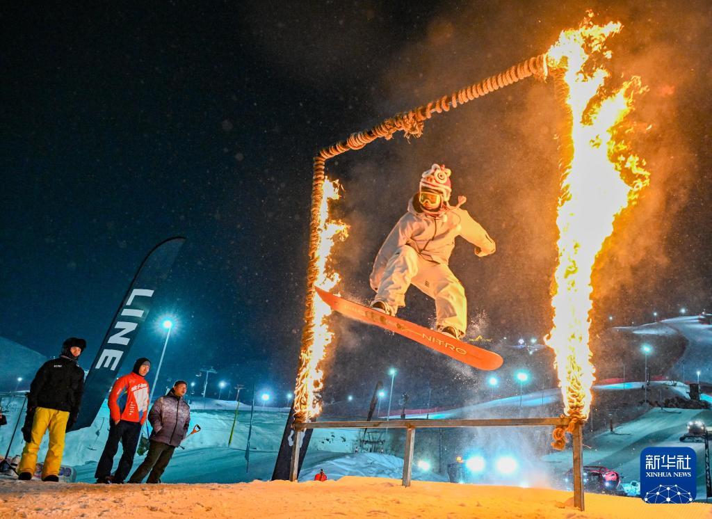 2025年1月29日,在坐落于阿勒泰市城區(qū)的新疆將軍山國際滑雪度假區(qū),雪友在新春趣味滑雪公園跳臺活動中鉆過火圈。新華社記者陳朔攝