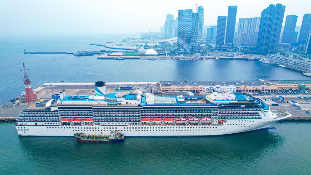2025年5月27日拍攝的??吭诖筮B港國際郵輪中心泊位的“愛達(dá)·地中?!碧枺o人機(jī)照片)。新華社記者 潘昱龍 攝