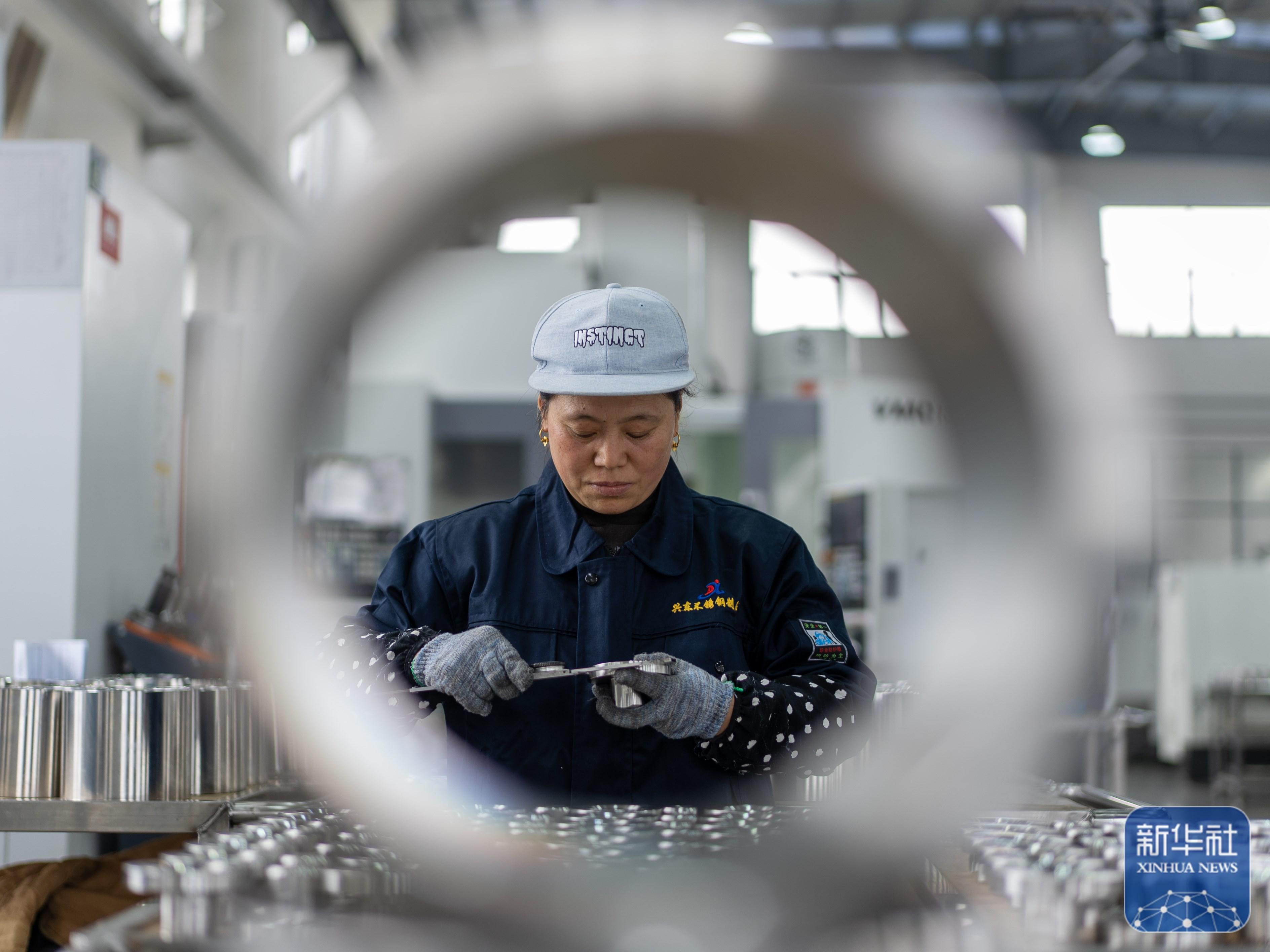 ↑ 1月5日,工人在位于江蘇省興化市戴南鎮(zhèn)的江蘇唐劉興東不銹鋼有限公司生產(chǎn)車間檢測(cè)產(chǎn)品。新華社發(fā)(周社根攝)