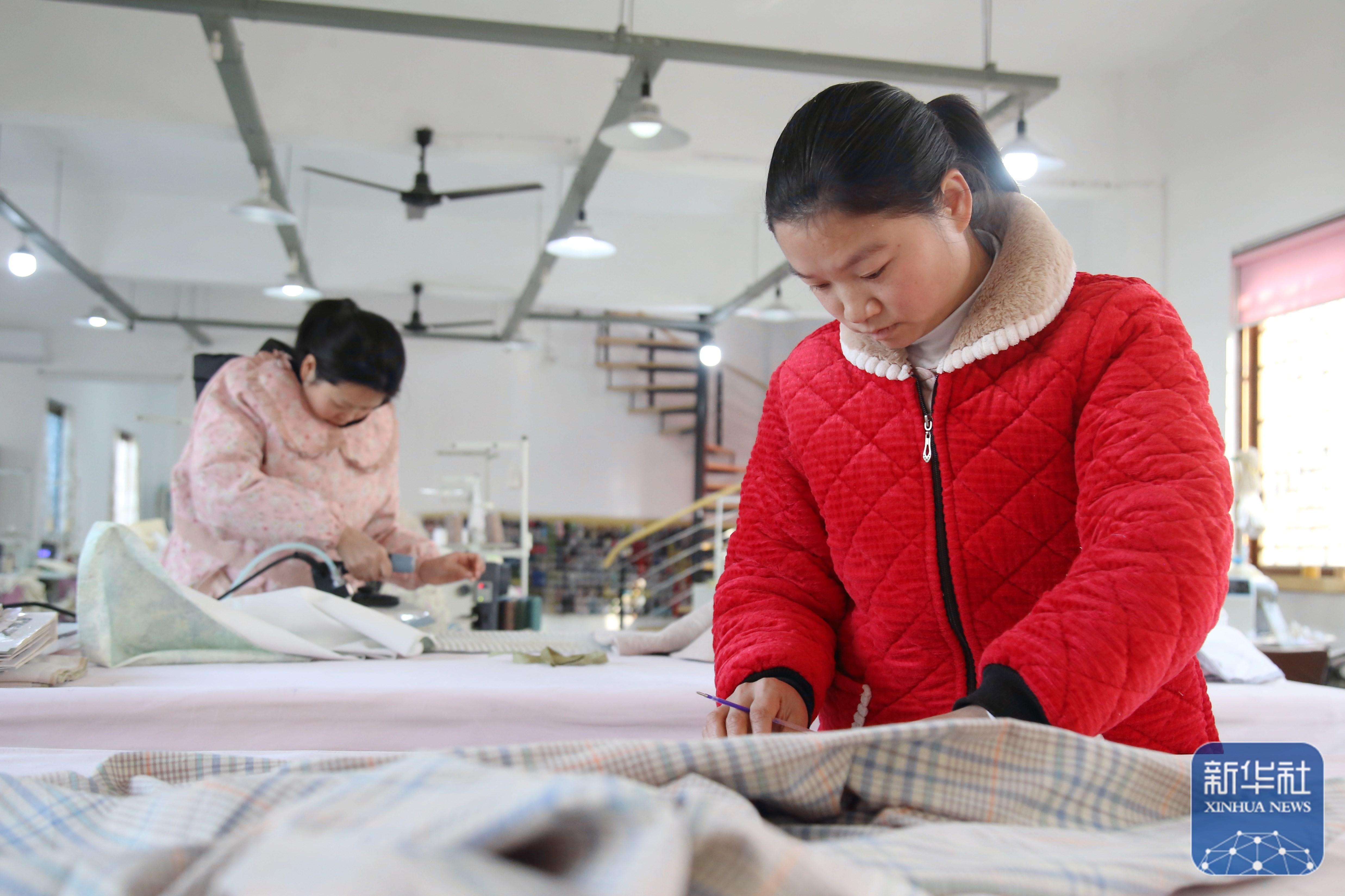 ↑ 1月5日,工人在湖北省十堰市鄖陽(yáng)區(qū)柳陂鎮(zhèn)龍韻村一家布藝加工廠忙碌。新華社發(fā)(曹忠宏 攝)