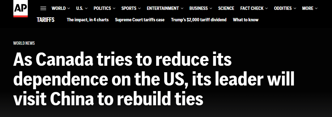 美聯(lián)社報道稱,加拿大總理此次訪華,旨在修復(fù)并改善兩國關(guān)系,為中加戰(zhàn)略伙伴關(guān)系的發(fā)展重新注入活力。報道援引卡尼的表態(tài)指出:“加拿大正在全球范圍內(nèi)構(gòu)建新的伙伴關(guān)系,以改變本國經(jīng)濟對單一貿(mào)易伙伴的依賴?!?/p>