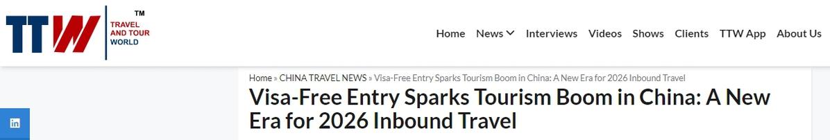 中國日報(bào)網(wǎng)1月16日電 2026年開年,中國入境游迎來強(qiáng)勁開局。數(shù)據(jù)顯示,多地旅游目的地客流均呈現(xiàn)顯著增長,適用免簽政策入境的外國人達(dá)到29.2萬人次,較去年同期增長35.8%。國際旅游行業(yè)媒體《旅行與旅游世界》網(wǎng)站(Travel And Tour World)持續(xù)關(guān)注中國蓬勃發(fā)展的旅游市場并在近日的報(bào)道中表示,在免簽政策紅利加持與國際連通性不斷提升的雙重推動(dòng)下,中國的旅游格局正經(jīng)歷深刻轉(zhuǎn)型,這一上升趨勢亦凸顯出中國作為全球旅游目的地的吸引力日益增強(qiáng)。