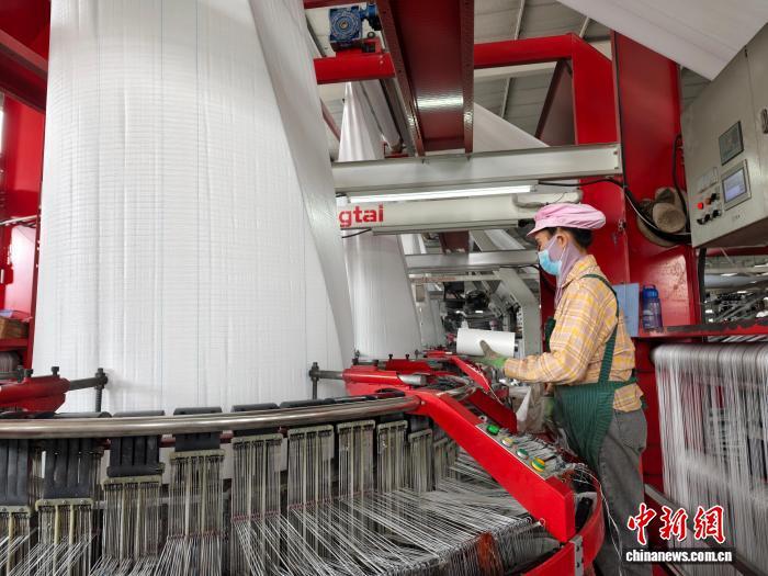 1月13日,儋州偉達化工有限公司生產(chǎn)車間內(nèi),工人正利用上游企業(yè)生產(chǎn)的聚乙烯開展再加工,制作集裝噸袋?!≈行律缬浾? 王子謙 攝