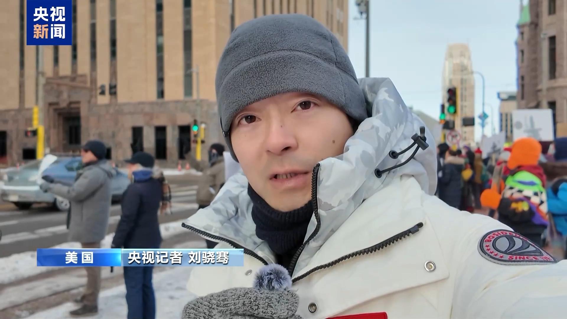 央視記者 劉驍騫:這里是明尼阿波利斯市的市中心,雖然當(dāng)?shù)氐臉O寒天氣延續(xù),但是依然有很多民眾走上街頭,以此來(lái)響應(yīng)當(dāng)?shù)貢r(shí)間20日全國(guó)性的抗議活動(dòng)。