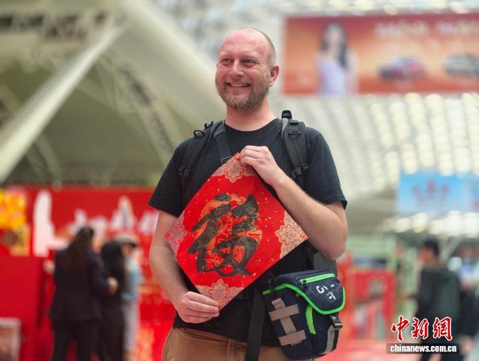 一名外國旅客被紅紙墨香吸引,從書法家那里取得了一個“福”字?!靶履昕鞓?,謝謝。”他將福字拿在手中,一邊拍照留念,一邊笑著用中文說道。